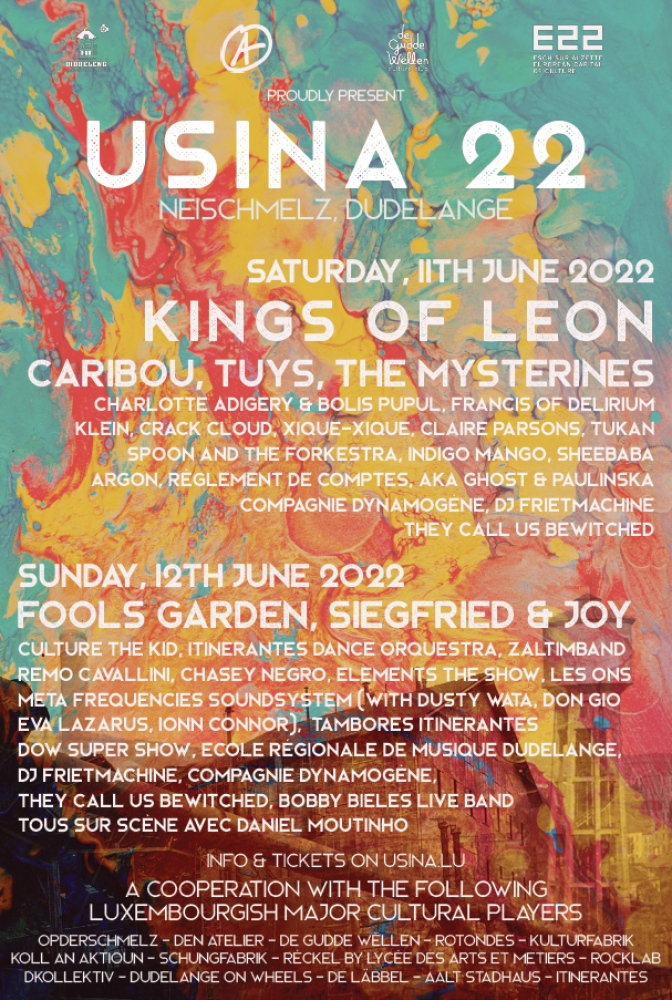 La performance en plein air du groupe Kings of Leon aura lieu sur le terrain de l'USINA22/Neischmelz, le site industriel historique au cœur de Dudelange, qui sera transformé en un havre de musique, de performances et d'échanges culturels, dans le cadre des festivités de la Capitale européenne de la culture en 2022. Avec: Kings of Leon • Caribou • Tuys • Charlotte Adigery & Bolis Pupul • The Mysterines • Francis of Delirium • Klein • Crack Cloud • Xique-Xique • Claire Parsons • Tukan • Spoon and the Forkestra • Indigo Mango • Sheebaba •Argon • Règlement de Comptes • Office Of Weird • Aka Ghost & Paulinska • Compagnie Dynamogène • They Call Us Bewitched • Dj Frietmachine