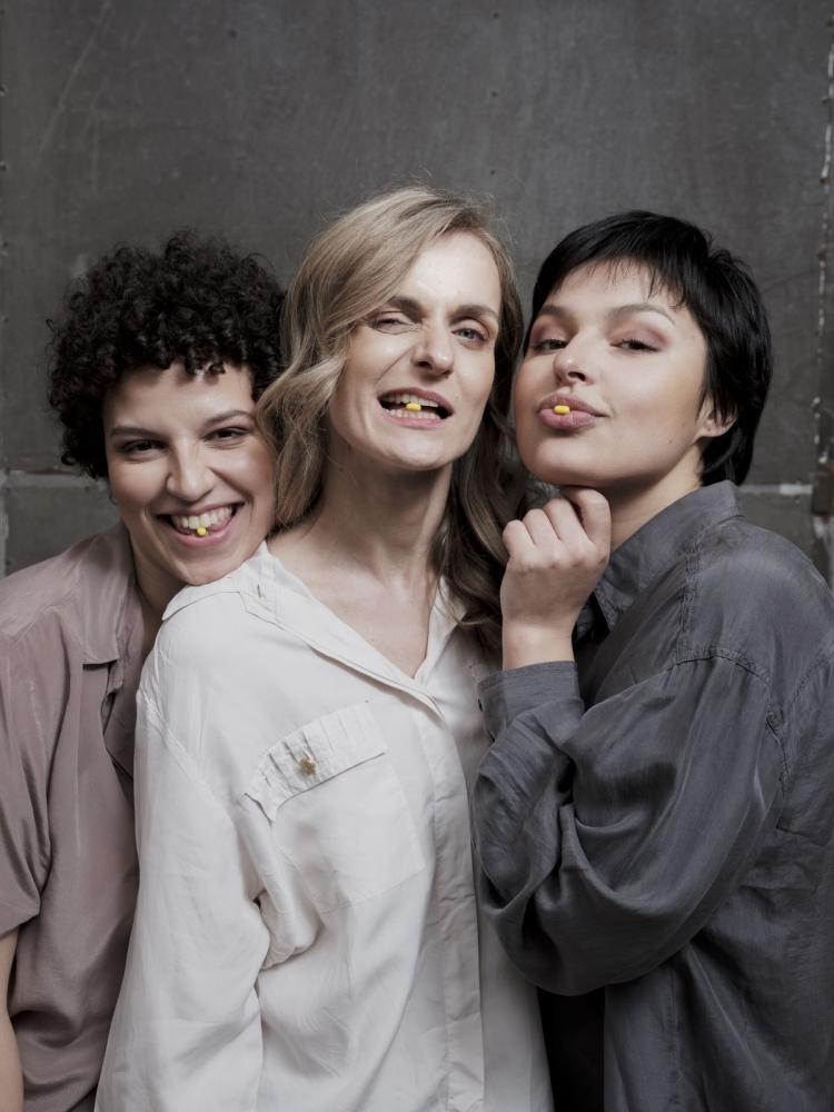 Writer/Director: Larisa Faber Dramaturge: Gabrielė Labanauskaitė Composer: Catherine Kontz Choreographer: Hannah Ma Designer: Marie-Luce Theis Video Designers: Shade Cumini Production Manager: Martyna Žukaitė Content Creators: Valeriia Voshchevska & Kassy Cho Stage Manager: Max Stoltz (at Amplitude) Musical Assistant: Luka Tonnar Actor-Musician: Teklė Baroti Actor-Musician: Monika Valkūnaitė Actor-Musician: Nora Zrika Illustrator (book): Eleonora Lushchyk Editor (book): Lilly Burton Graphic Designer (book): Christelle Van den Broeck (at Planning Familial) Produced by anonyma. Coproduced by Théâtre d'Esch. Supported by Esch 2022 European Capital of Culture and Planning Familial. In association with Kaunas Chamber Theatre, Kaunas 2022 and Camden People's Theatre London.Description