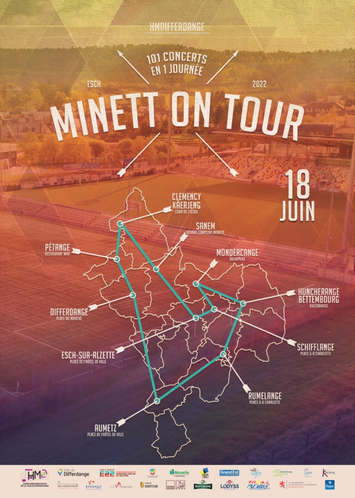 Chaque ville participante sera représentée par un orchestre ou un ensemble musical qui participera au projet. Chaque orchestre jouera un concert de 10 minutes dans chaque ville participante, donc 10 concerts entre 9.00 et 19.00 heures et 100 concerts au total. Chaque société commencera le tour dans sa propre ville et suivra par après l’itinéraire suivant: Differdange / Pétange / Bascharage / Sanem / Esch / CCPHVA/ Rumelange / Kayl / Bettembourg (Huncherange) / Schifflange / Mondercange. Un concert final avec plus de 2022 musiciens aura lieu à partir de 19.30 heures au stade municipal d'Oberkorn.
