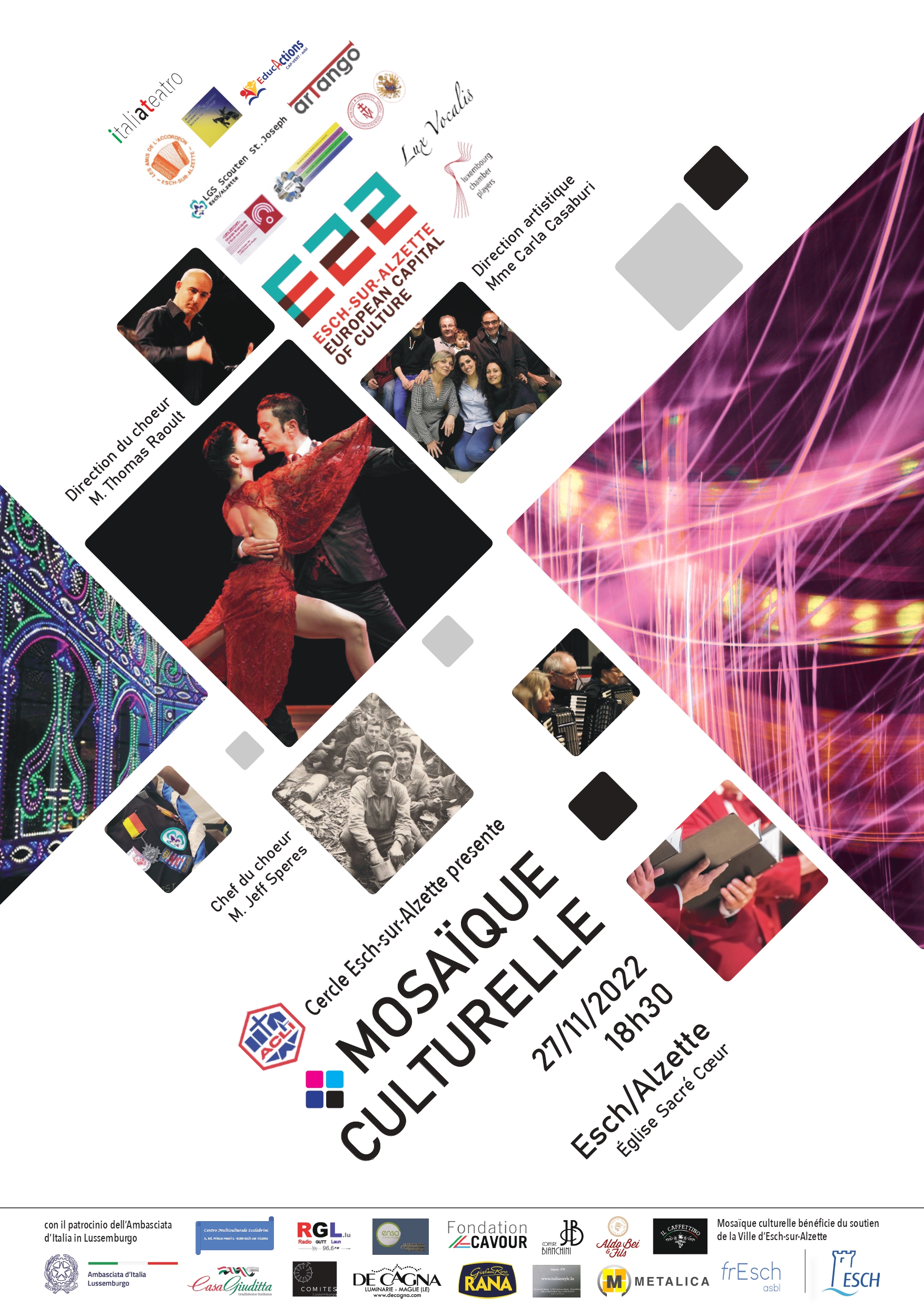 Nous avons imaginé un projet multiculturel marqué par la mémoire de l’immigration mais aussi par l’avenir des personnes présentes sur le territoire et leur intégration. La musique, la littérature, le théâtre et la danse sont des thèmes forts qui unissent les gens et même la religion au-delà des schémas habituels. Ils sont des langages universels. Une église peut accueillir un spectacle, le mélange de sacré et profane, la nourriture et la danse interprétés de manière traditionnelle et pourtant intercalés de manière innovante. Ce projet veut atteindre un public très large, fait soit d’amateurs de musique et de spectacle dans leurs formes les plus raffinées, soit d’un public plus simple, auquel il est possible de toucher les cordes émotionnelles profondes.